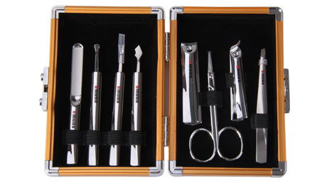 產(chǎn)品規(guī)格:136mm*100mm 產(chǎn)品重量:295g 天地盒規(guī)格:145mm*108mm*35mm 材質:鋁材+420不銹鋼+碳鋼+鋅合金 配件:平口指甲鉗、美容剪、斜口指甲鉗、眉夾、指甲銼、刮刀、死皮刀、耳挖 套裝顏色:金色